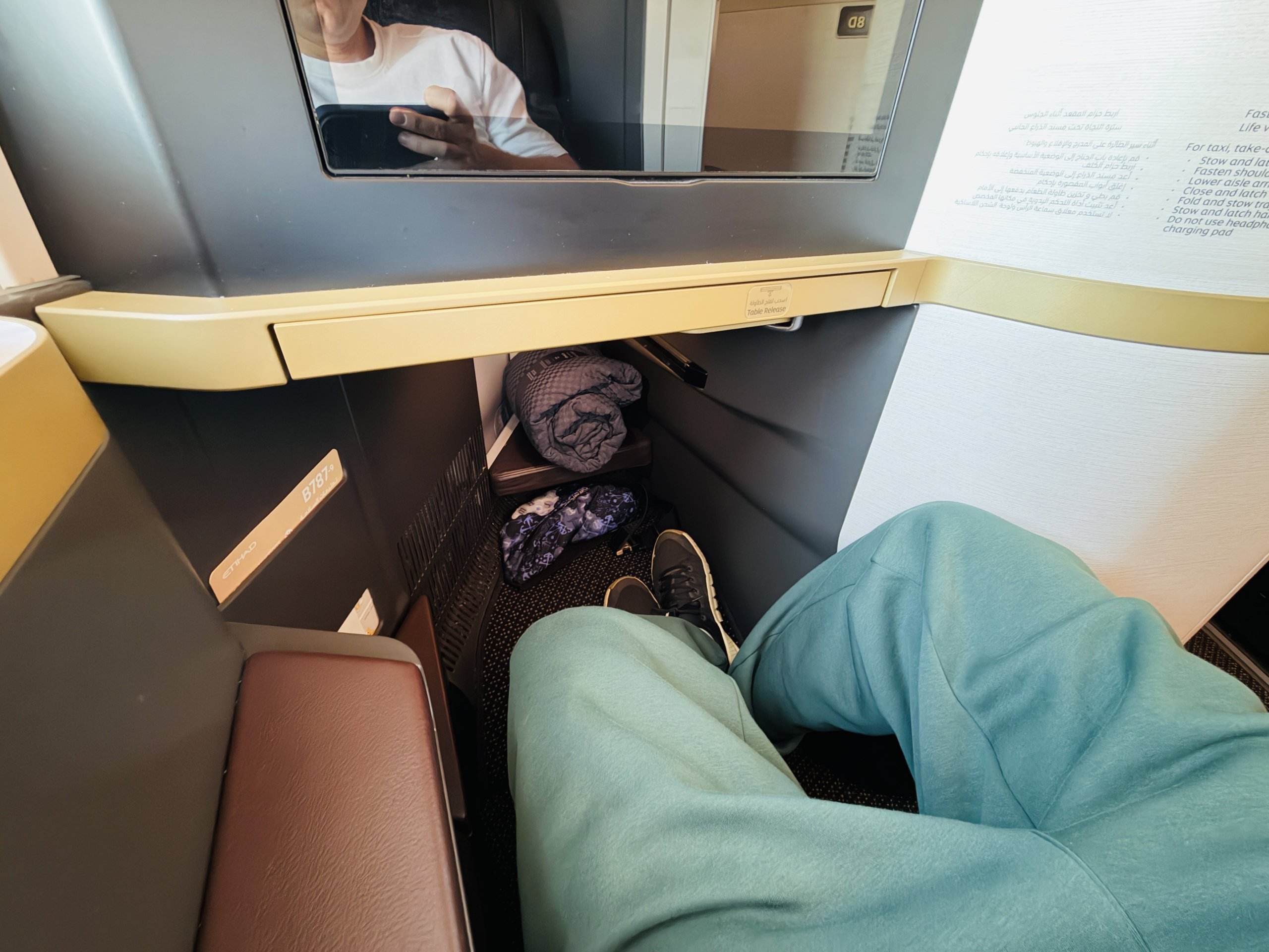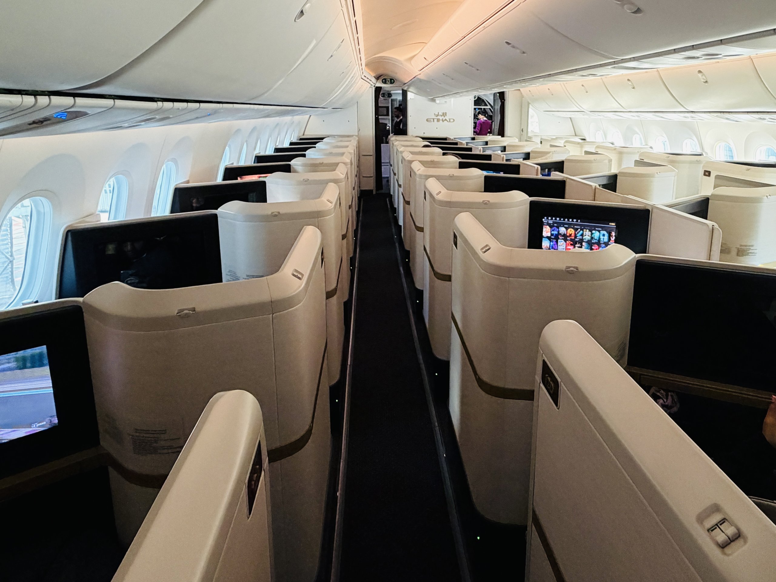 Kabína má pre mňa ideálne rozloženie sedadiel 1 - 2 - 1, pričom v porovnaní s ostatnými lietadlami Etihad B789 sú všetky sedadlá navyše v smere letu.