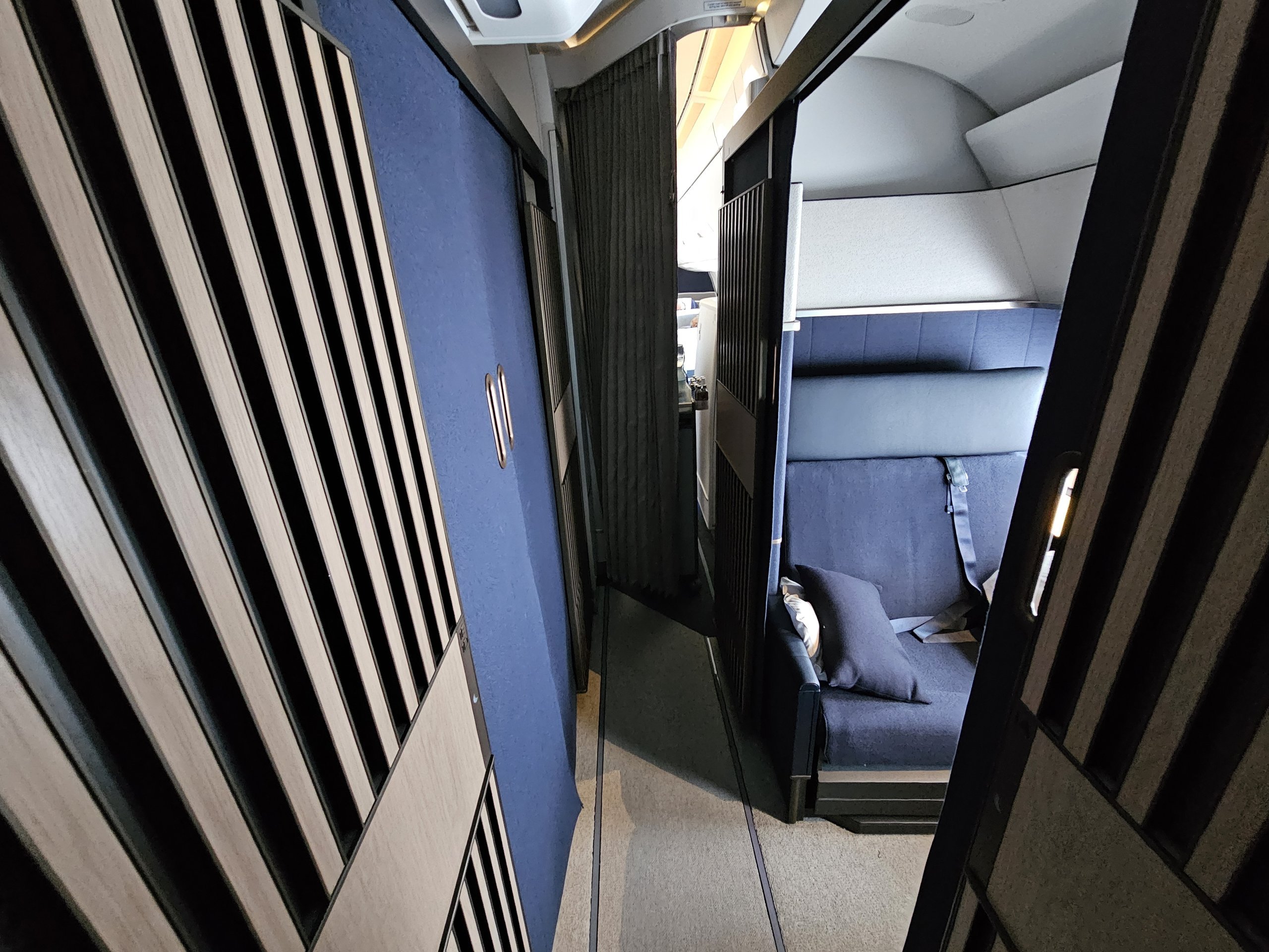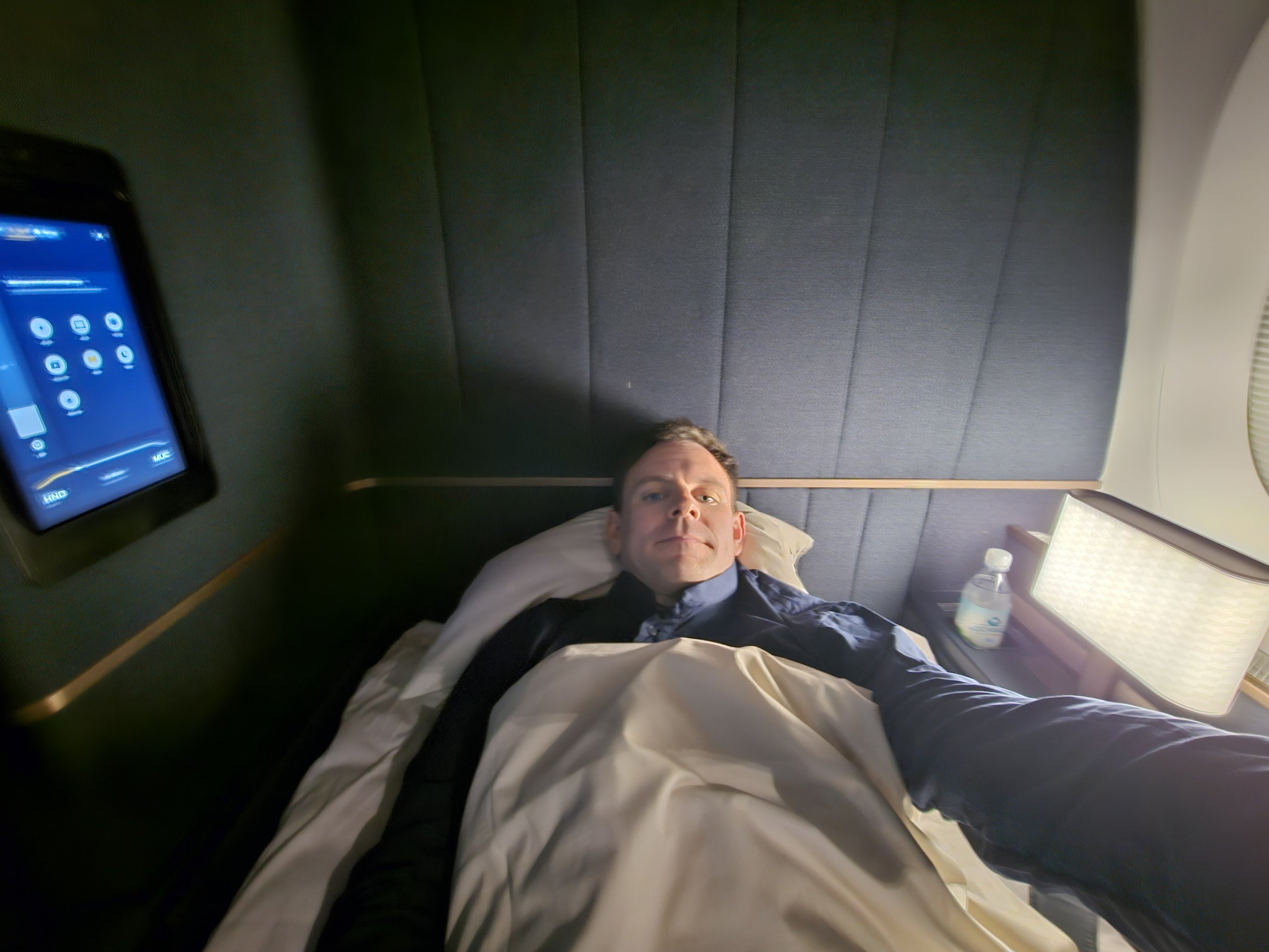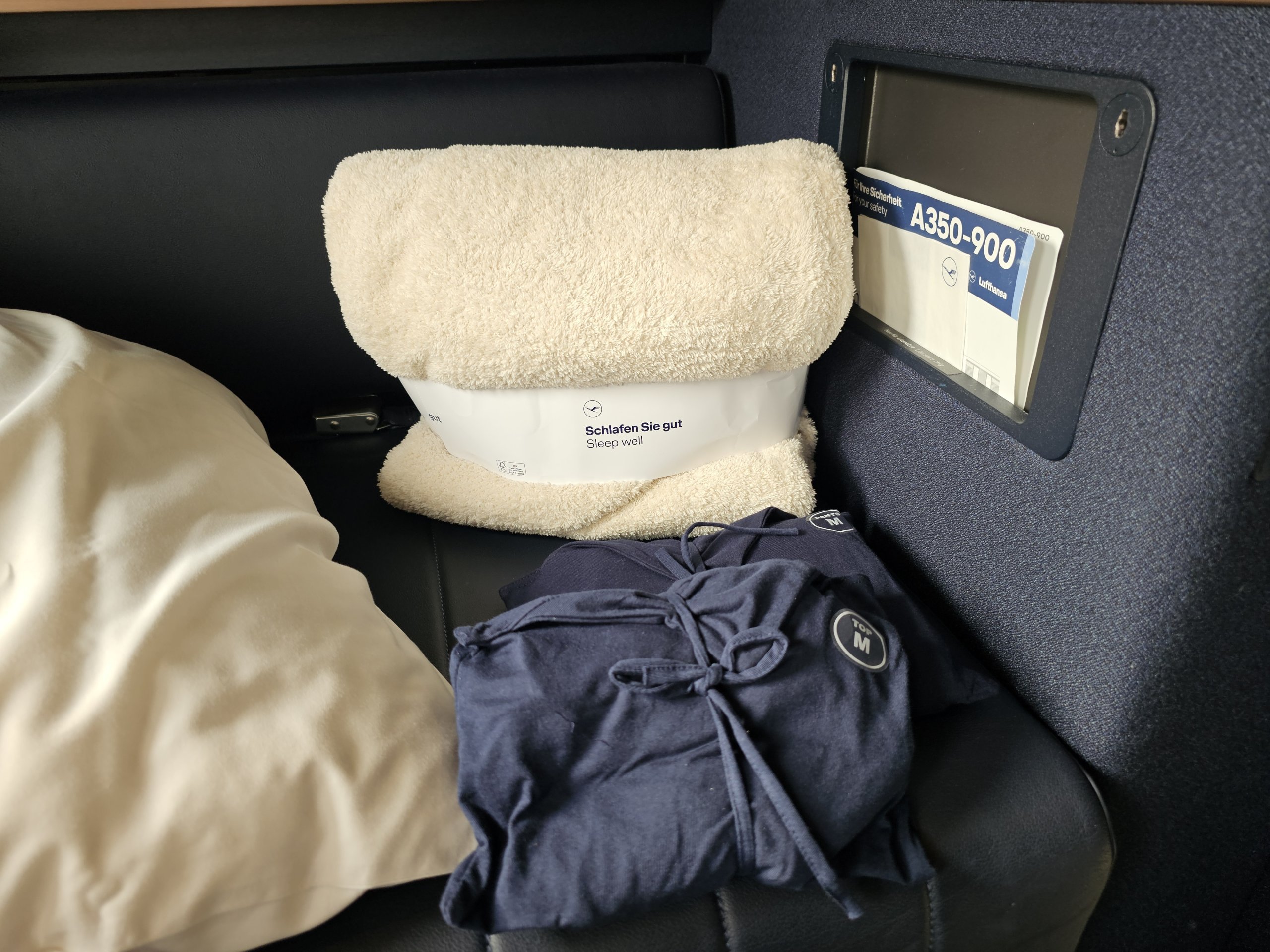 Krátko po obede sa teda vyberiem na toaletu, aby som sa prezliekol do pyžama. Ochotný stevard mi medzitým pripraví posteľ (sedadlo si môžete rozložiť sami stlačením tlačidla, ale plachty a prikrývka sú umiestnené v priehradkách, ku ktorým má prístup len posádka).