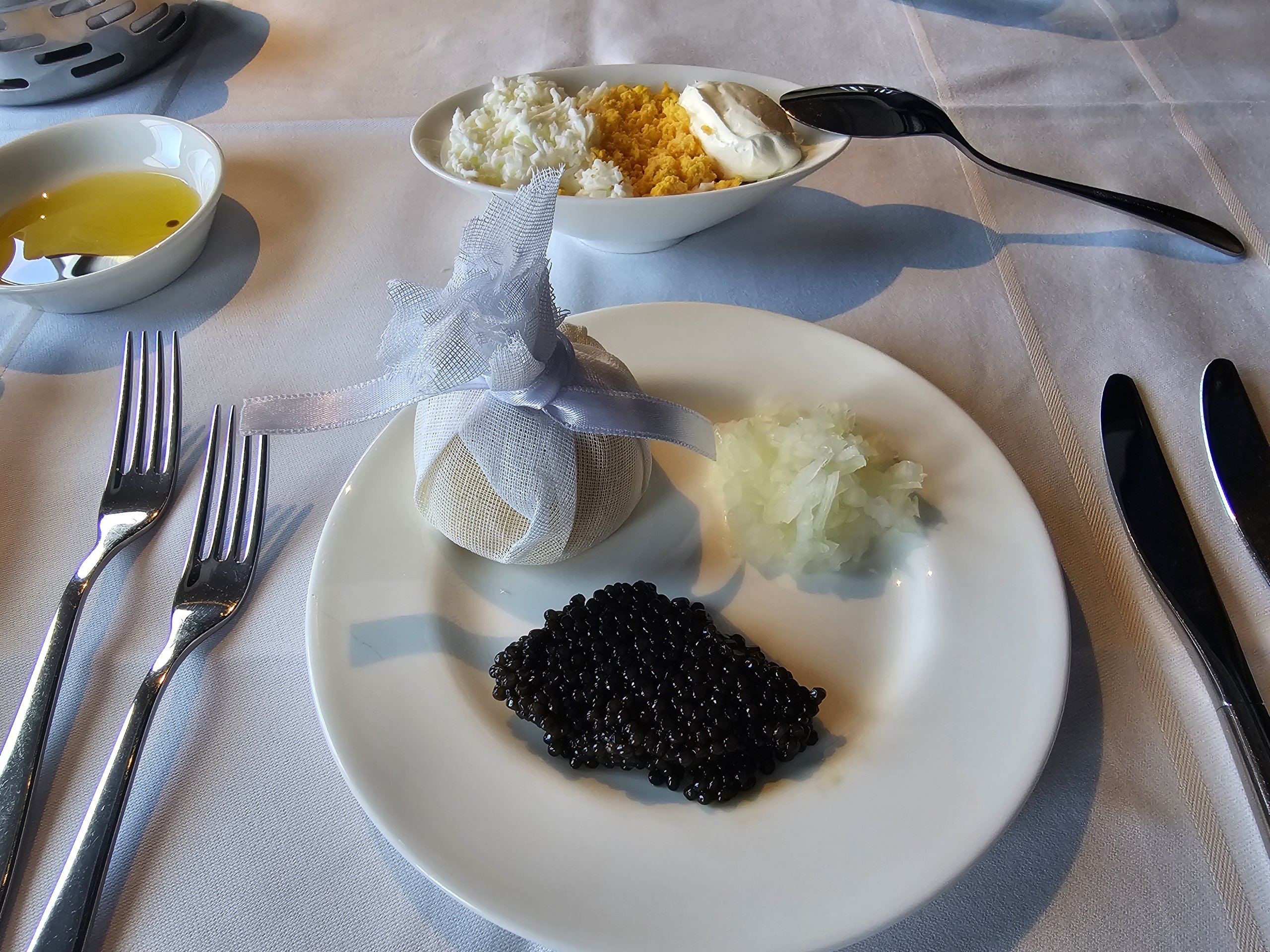 Ešte pred hlavným servisom prichádza na rad kaviár - charakteristický produkt spoločnosti Lufthansa v prvej triede. Kaviárový servis je jednoducho pojem tejto leteckej spoločnosti, ktorý poznajú všetci pravidelní cestujúci a milovníci letov.