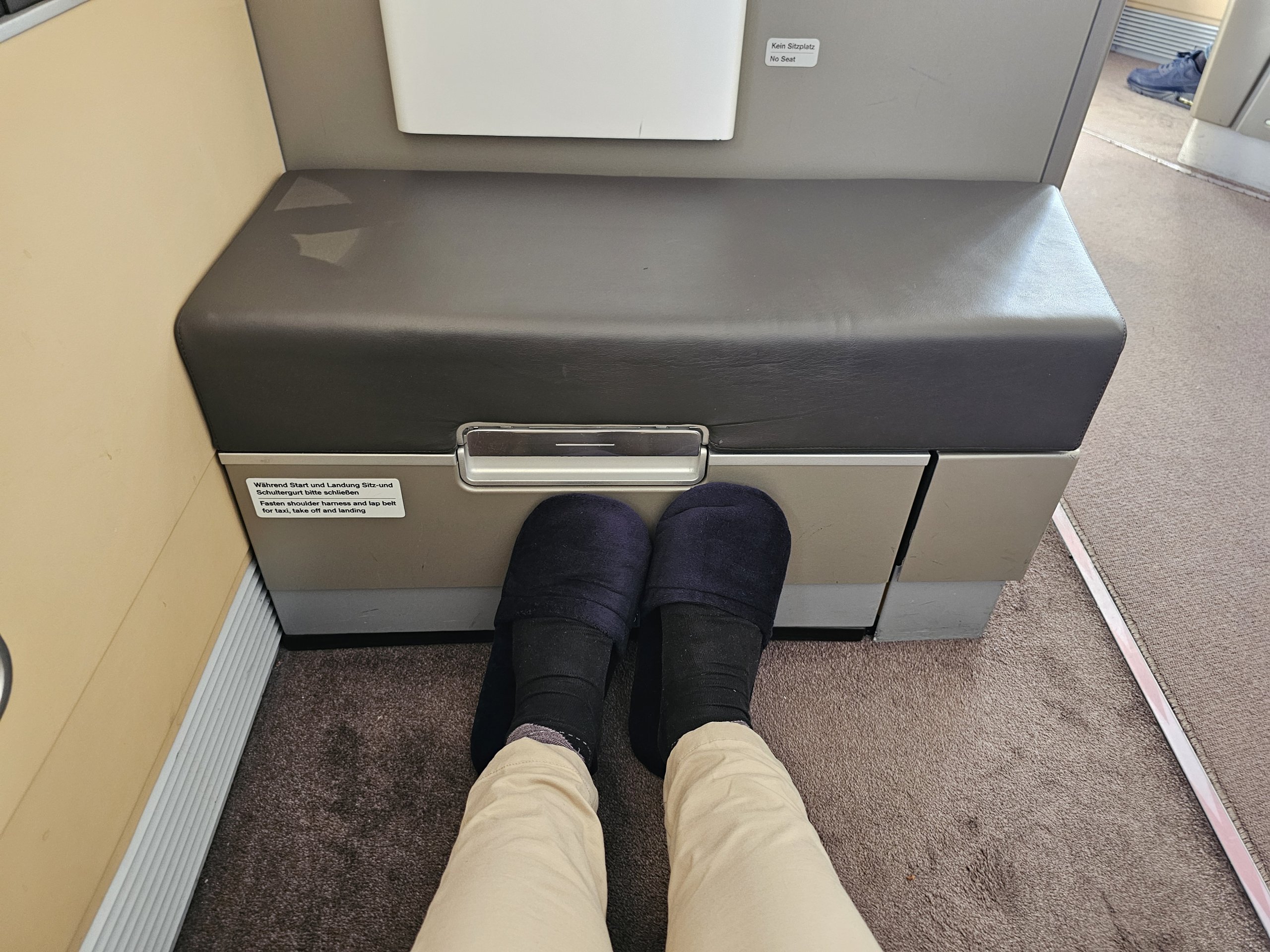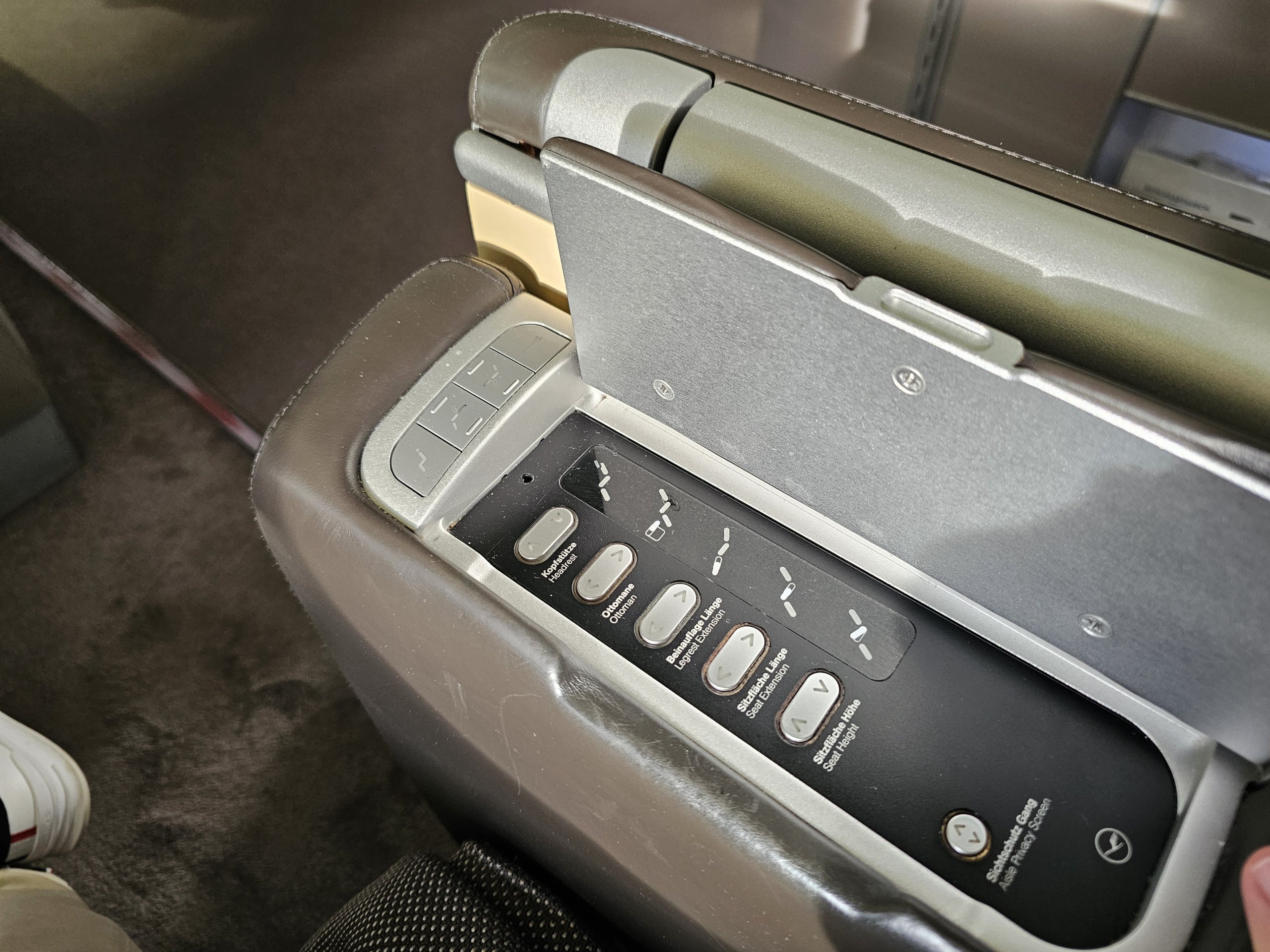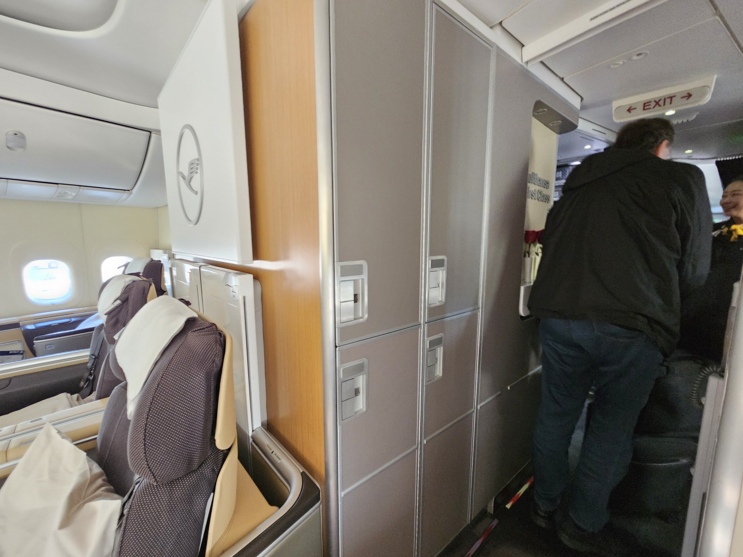 Sedadlá v starej prvej triede spoločnosti Lufthansa nie sú od uličky oddelené žiadnymi dverami ani závesom od podlahy po strop, ale len pomerne nízkou zástenou, ktorá jednoducho nemôže vytvoriť pocit úplného súkromia.
