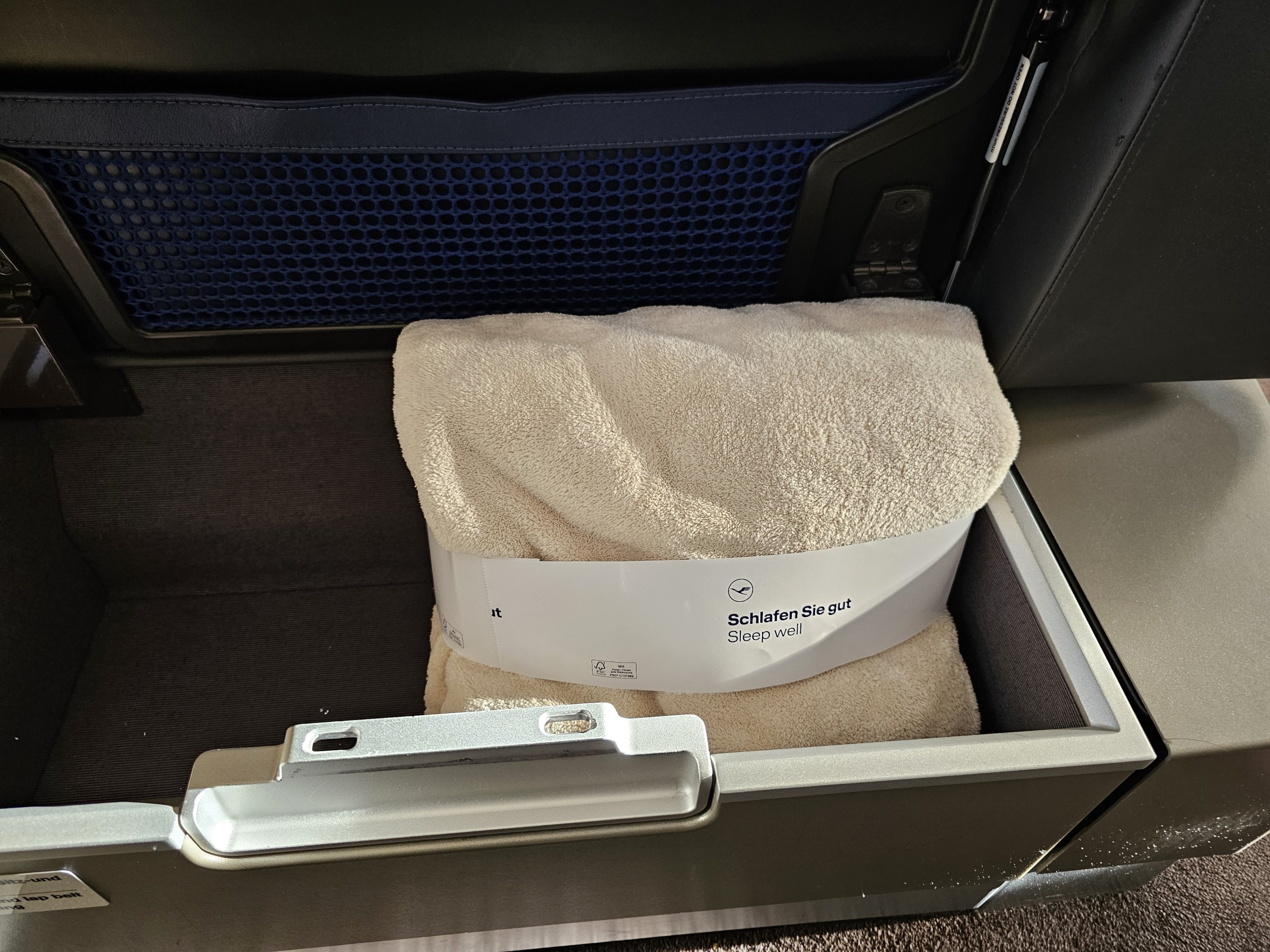 Sedadlo je vybavené mimoriadne pohodlným vankúšom a prikrývkou, ktoré sa dajú použiť kedykoľvek počas letu. Na spanie potom dostanete od posádky ďalšiu prikrývku a posteľnú bielizeň.