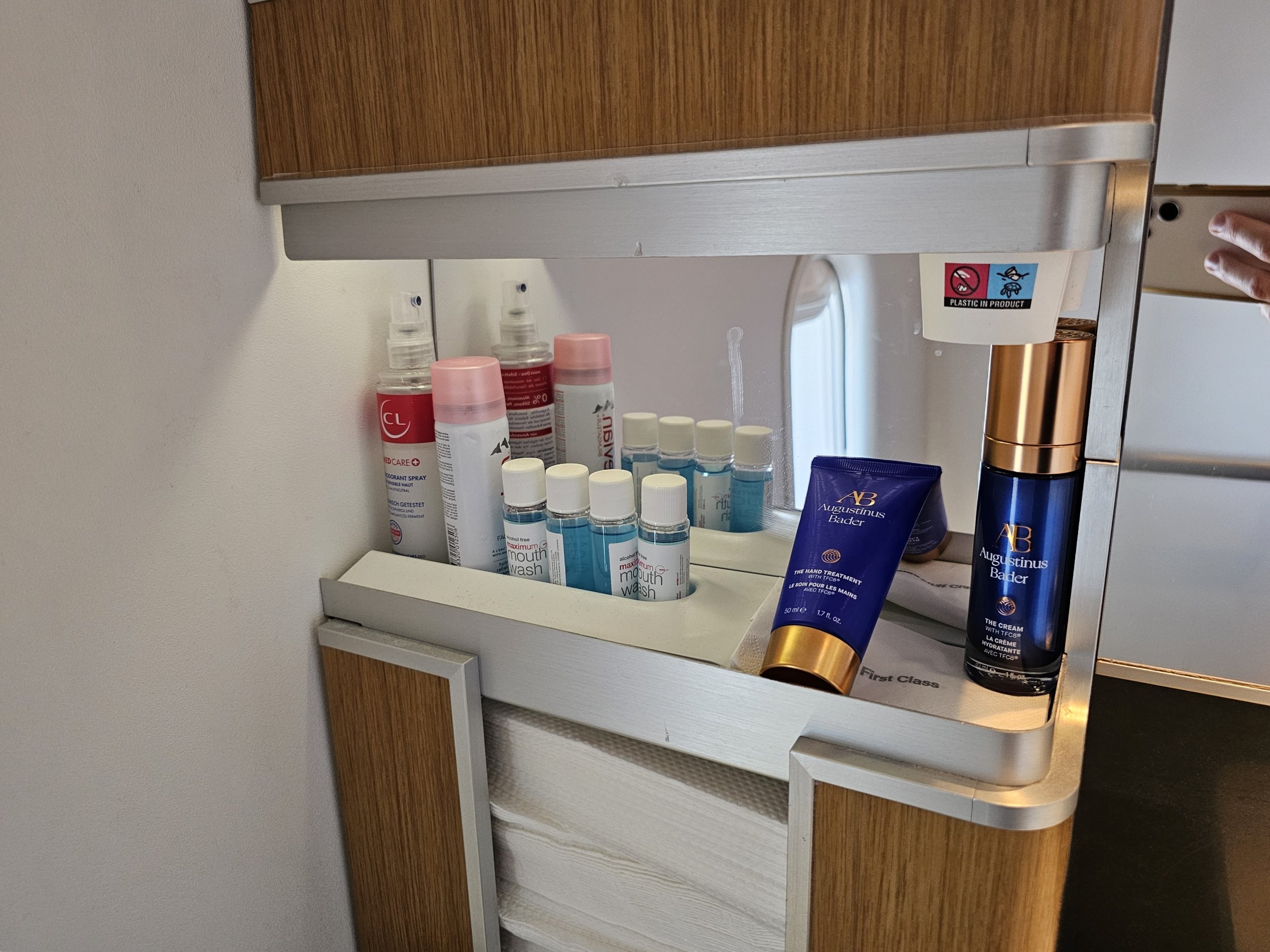 Na toaletách, ktoré sú určené len pre prvú triedu, si môžete voľne vziať fľaštičky s ústnou vodou, vlhčené obrúsky alebo krémy na ruky.