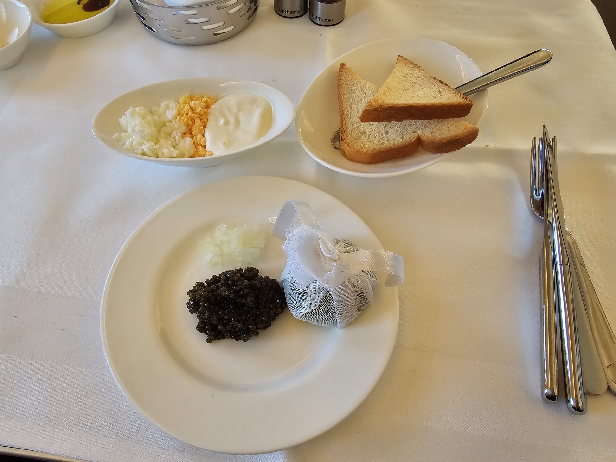 Ešte pred hlavným servisom prichádza na rad kaviár - charakteristický produkt spoločnosti Lufthansa v prvej triede. Kaviárový servis je jednoducho pojem tejto leteckej spoločnosti, ktorý poznajú všetci pravidelní cestujúci a milovníci letov.