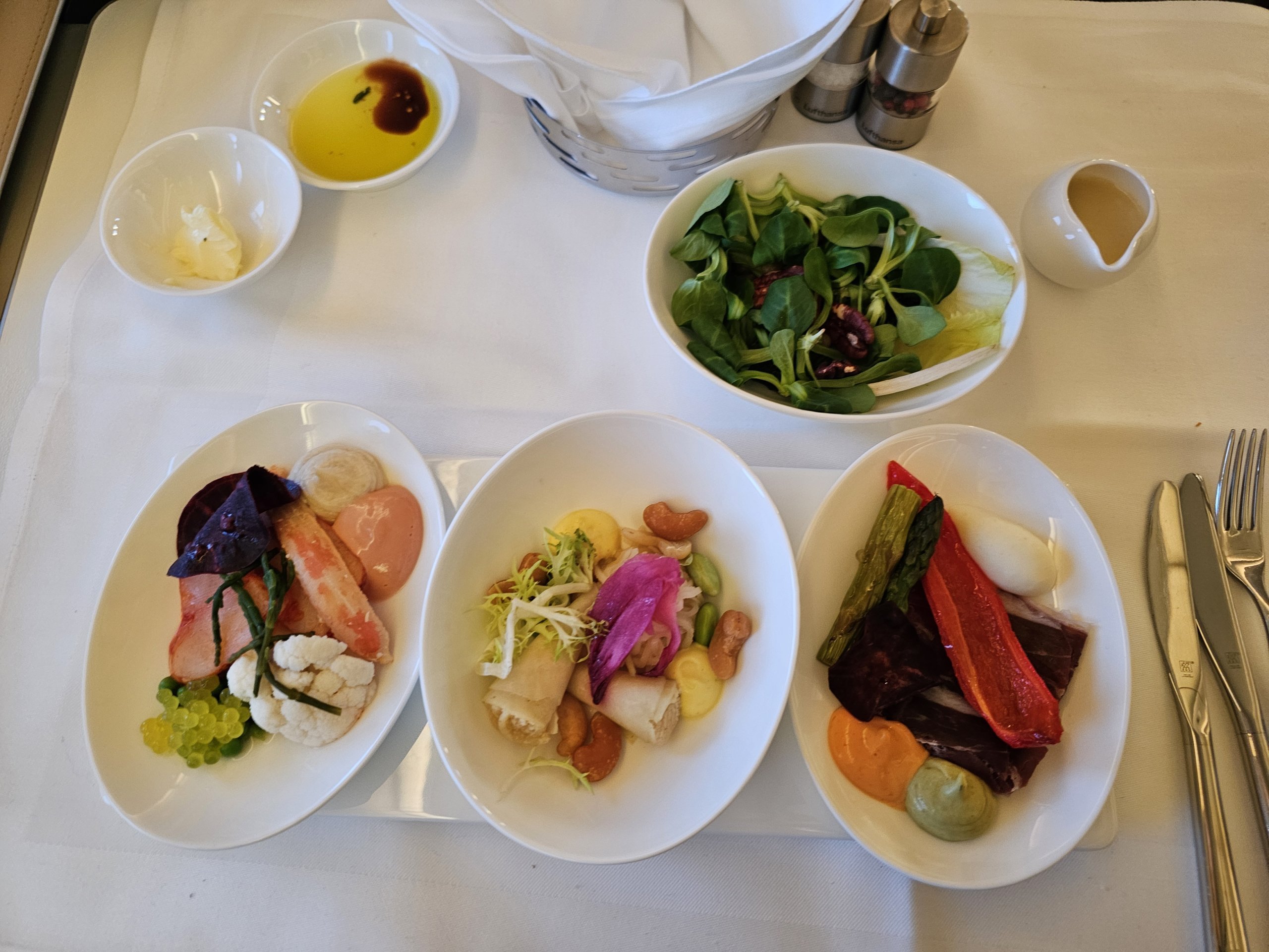 Predjedlo je veľmi čerstvé, farebné, ľahké a chutné! Páči sa mi jeho prezentácia a v porovnaní so servisom v biznis triede je tu viac jedla a oveľa väčší výber.