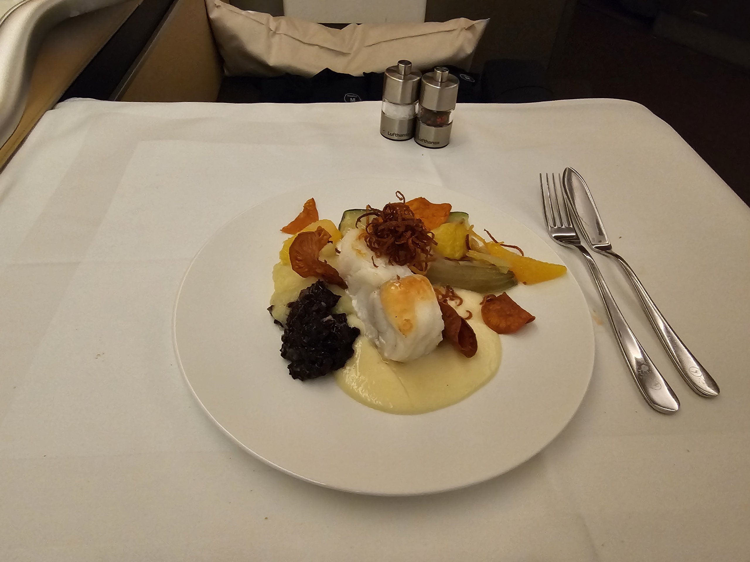 Ako hlavný chod som si vybral rybu - morského čerta - s omáčkou Beurre Blanc. Tentoraz je pre mňa prezentácia oveľa horšia ako pri predjedle, ale jedlo je chutné a hlavne ľahké. Presne také, aké si predstavujem počas diaľkového letu.