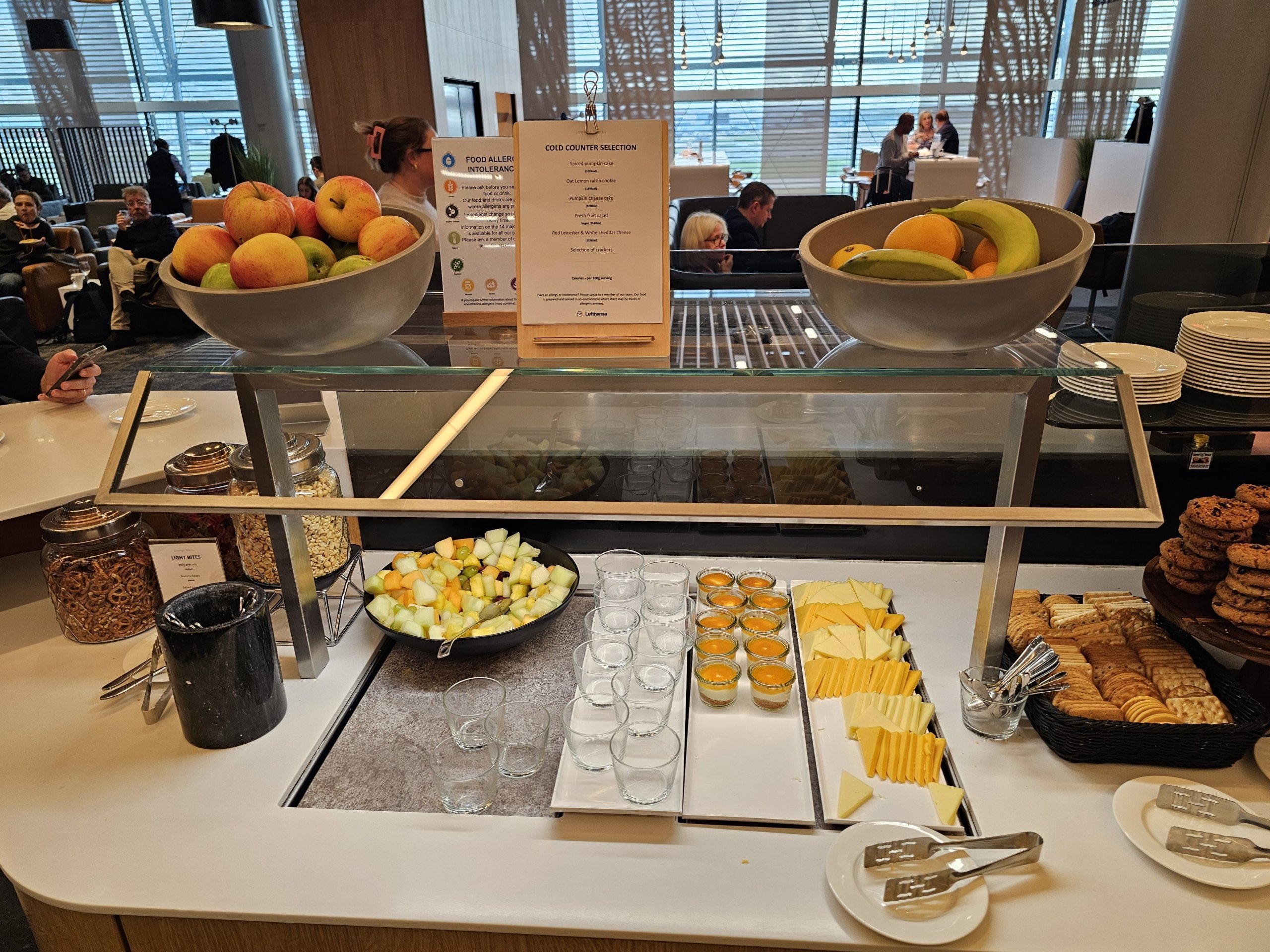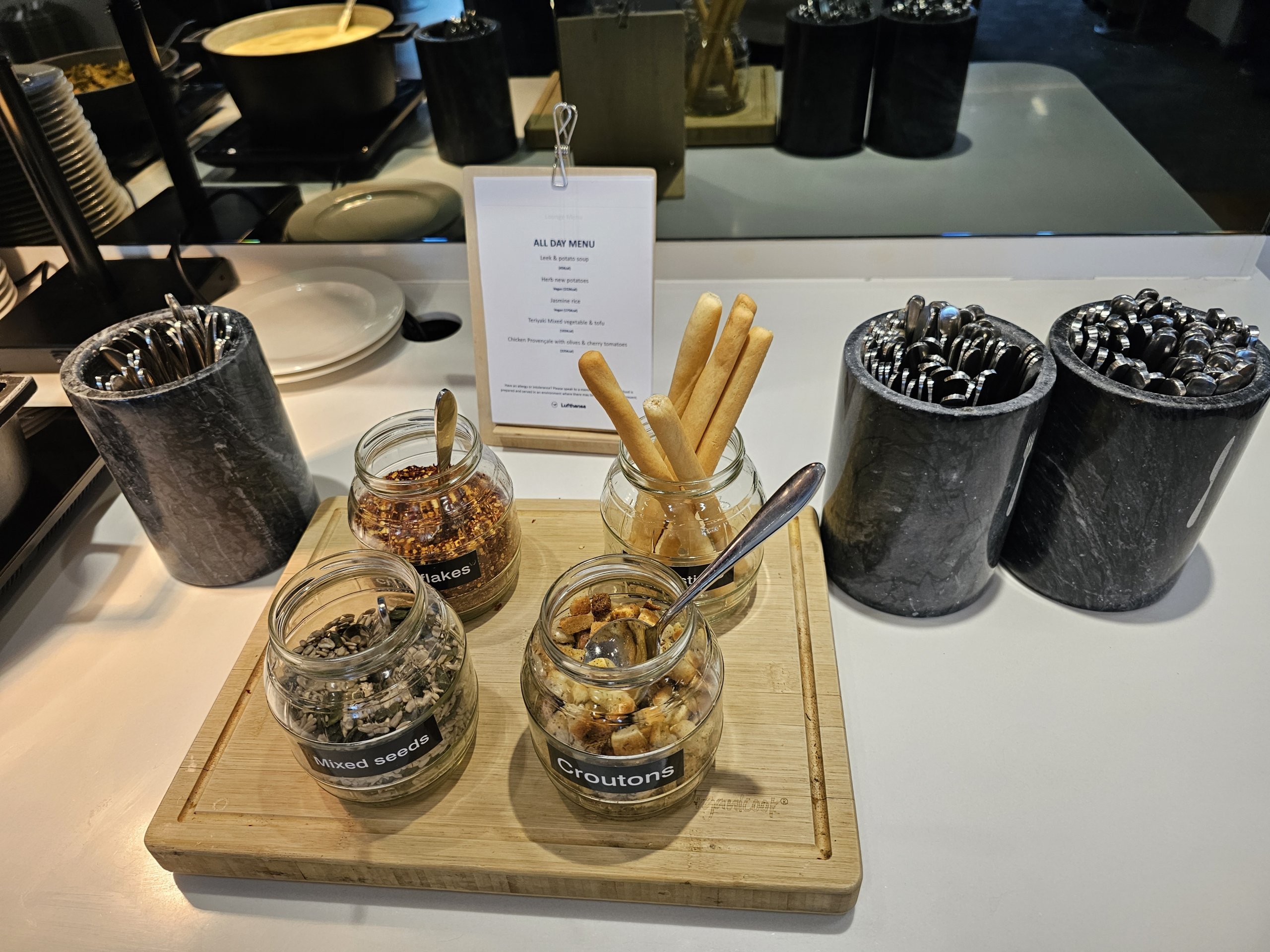 Hoci na mnohých letiskách majú v salóniku Senator lepšiu ponuku jedál a nápojov, v londýnskom salóniku Lufthansa je ponuka jedál a nápojov v salóniku Business a Senator rovnaká.