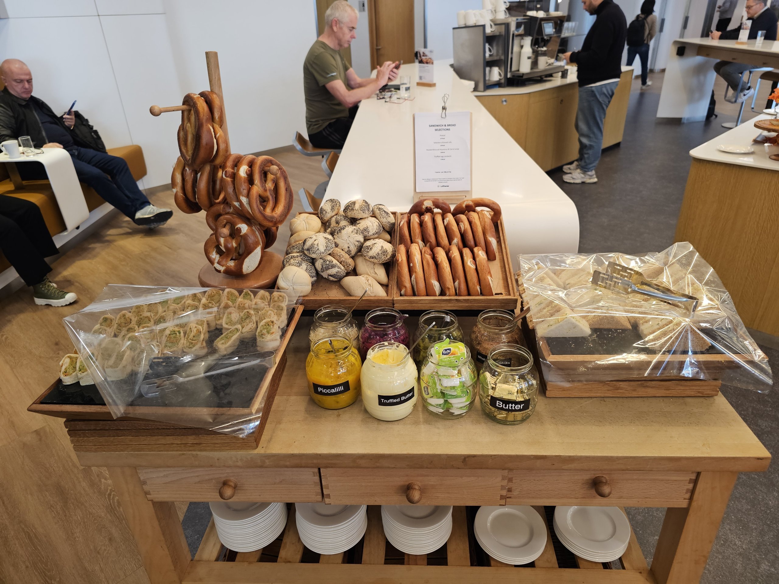 Salónik spoločnosti Lufthansa na letisku Heathrow je celkom príjemným miestom na rýchle občerstvenie pred letom, ako aj na rýchlu prácu pri mnohých stoloch vhodných pre notebooky.
